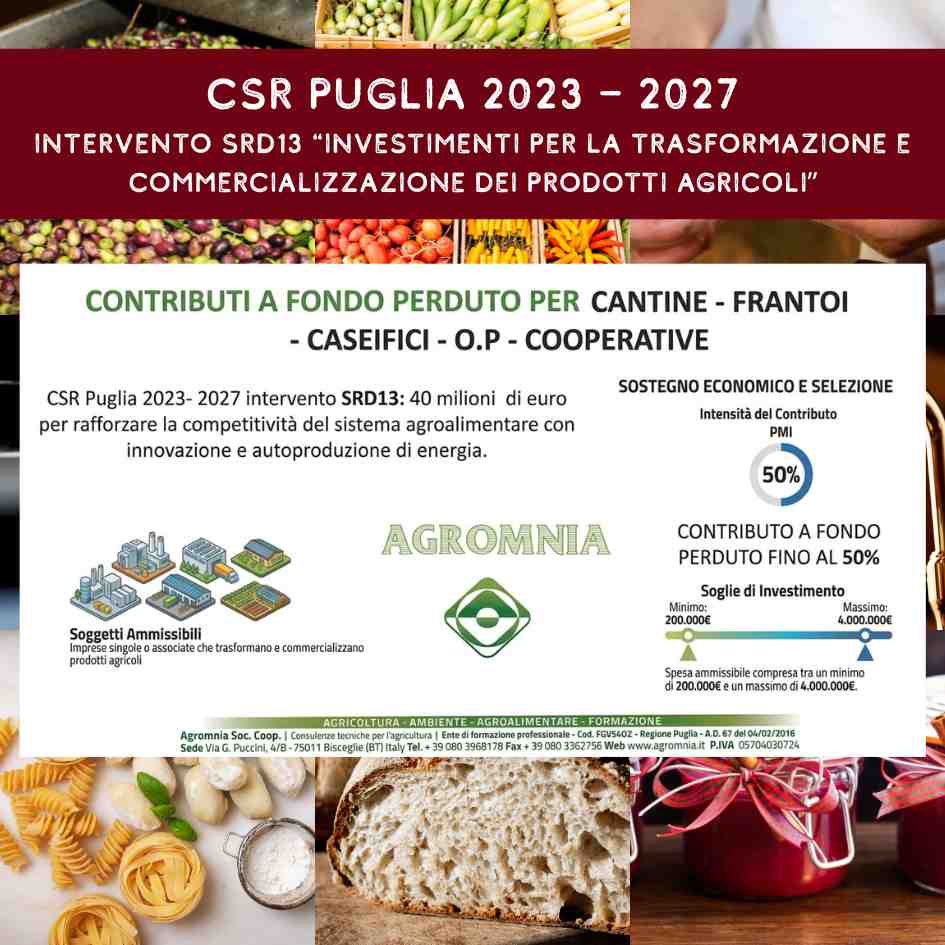 – Lโintervento sostiene investimenti materiali e immateriali delle imprese attive nella trasformazione e/o commercializzazione dei prodotti agricoli. Ai fini del presente intervento, per processi di trasformazione e commercializzazione si intendono uno o piรน dei seguenti processi: cernita, lavorazione, conservazione, stoccaggio, condizionamento, trasformazione, confezionamento, commercializzazione dei prodotti della filiera agroindustriale.